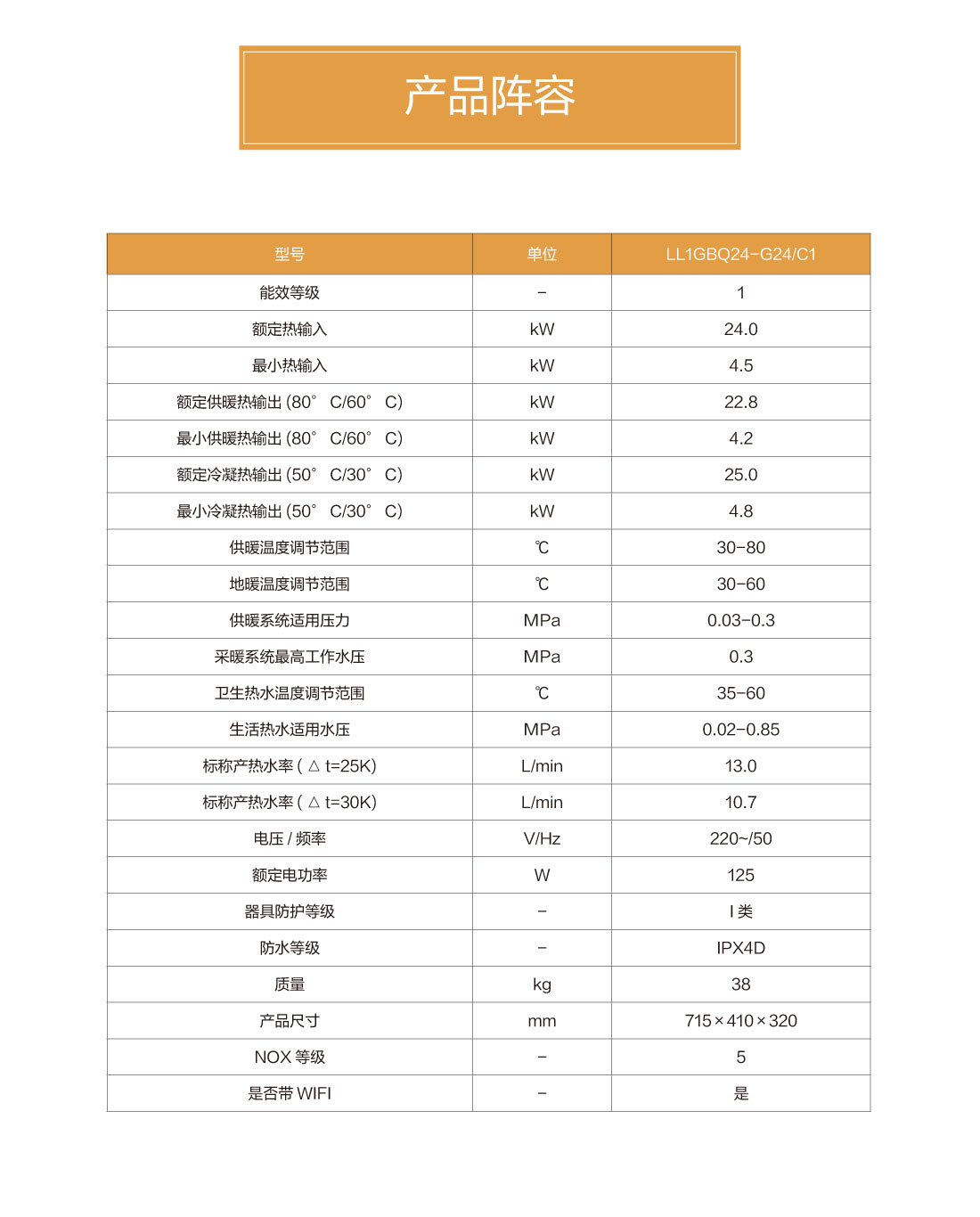 全预混燃烧结合双宽域功率调节,节能恒温,温差在±0.5℃之间,保证热水四季恒温快速出热水,减少水流浪费,生活水温度35-60℃,采暖水温30-80℃