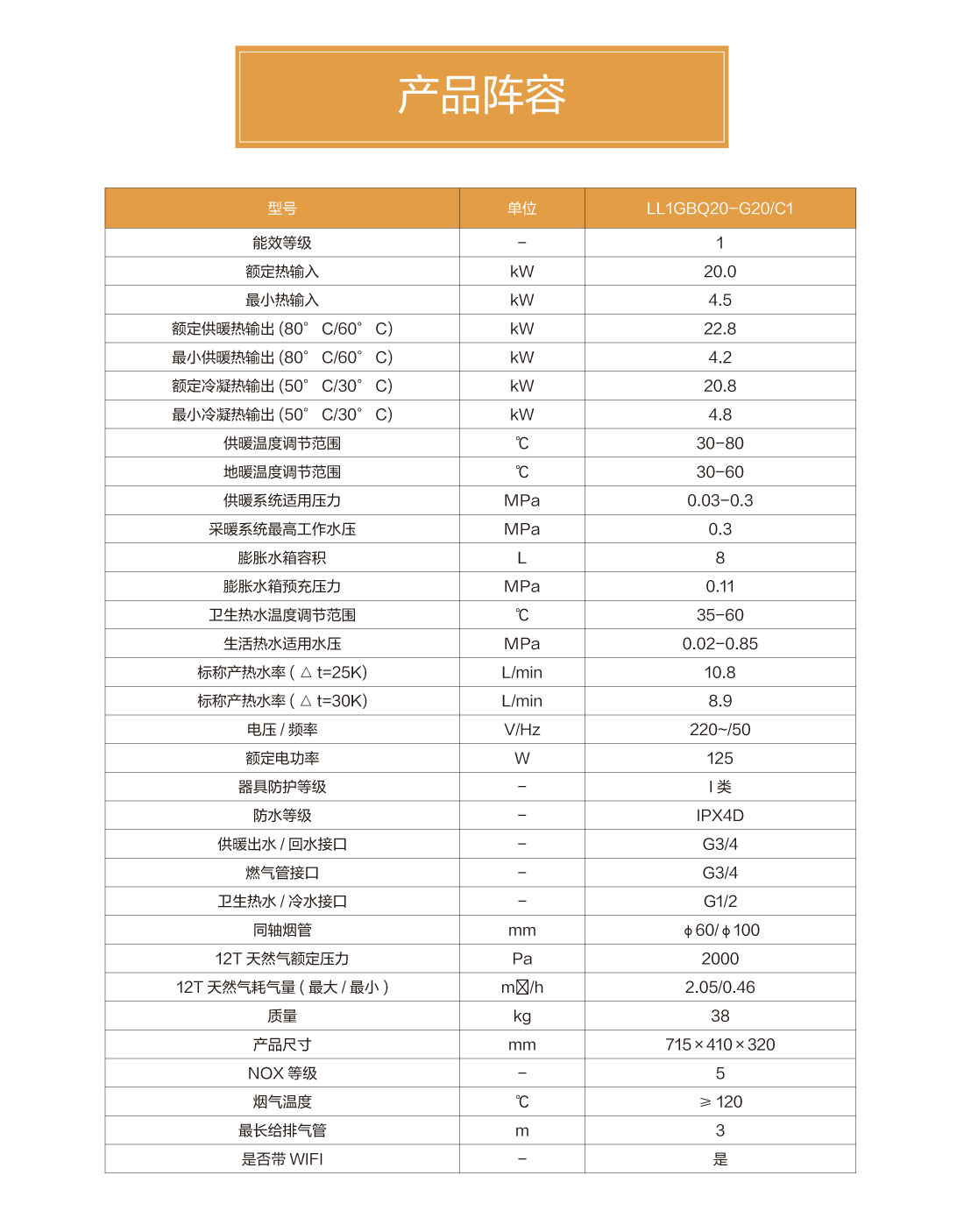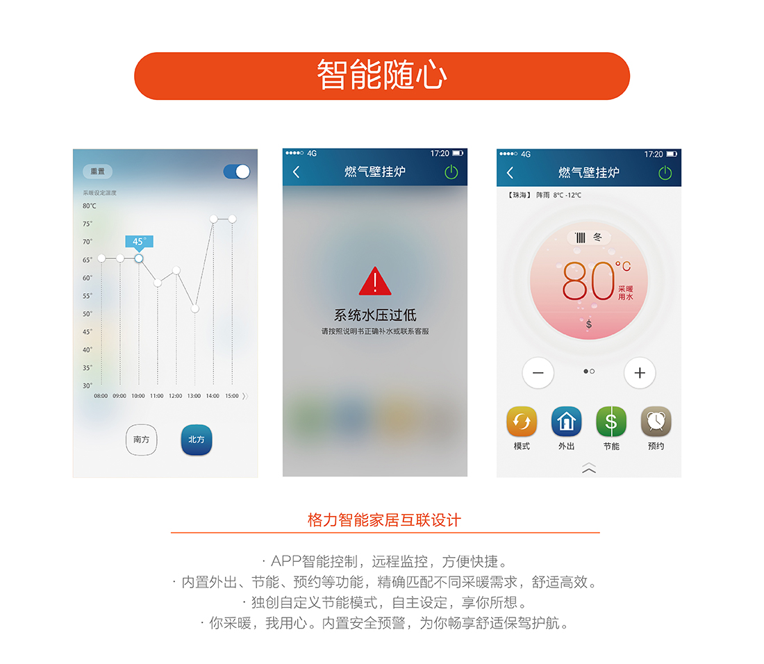 全预混燃烧结合双宽域功率调节,节能恒温,温差在±0.5℃之间,保证热水四季恒温快速出热水,减少水流浪费,生活水温度35-60℃,采暖水温30-80℃