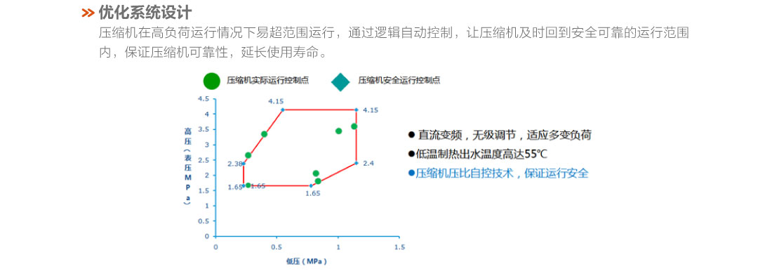 采用直流变频技术,制热量范围8.5~16kW,稳定运行环境温度范围-20℃~28℃、出水温度范围25~55℃,具有低温强热、节能高效、稳定可靠等特点,适用于集中供暖覆盖不足的农村及城郊地区以及城市独立供暖的公寓、复式楼、别墅、单元写字楼、餐厅、商店、娱乐场所等空间.