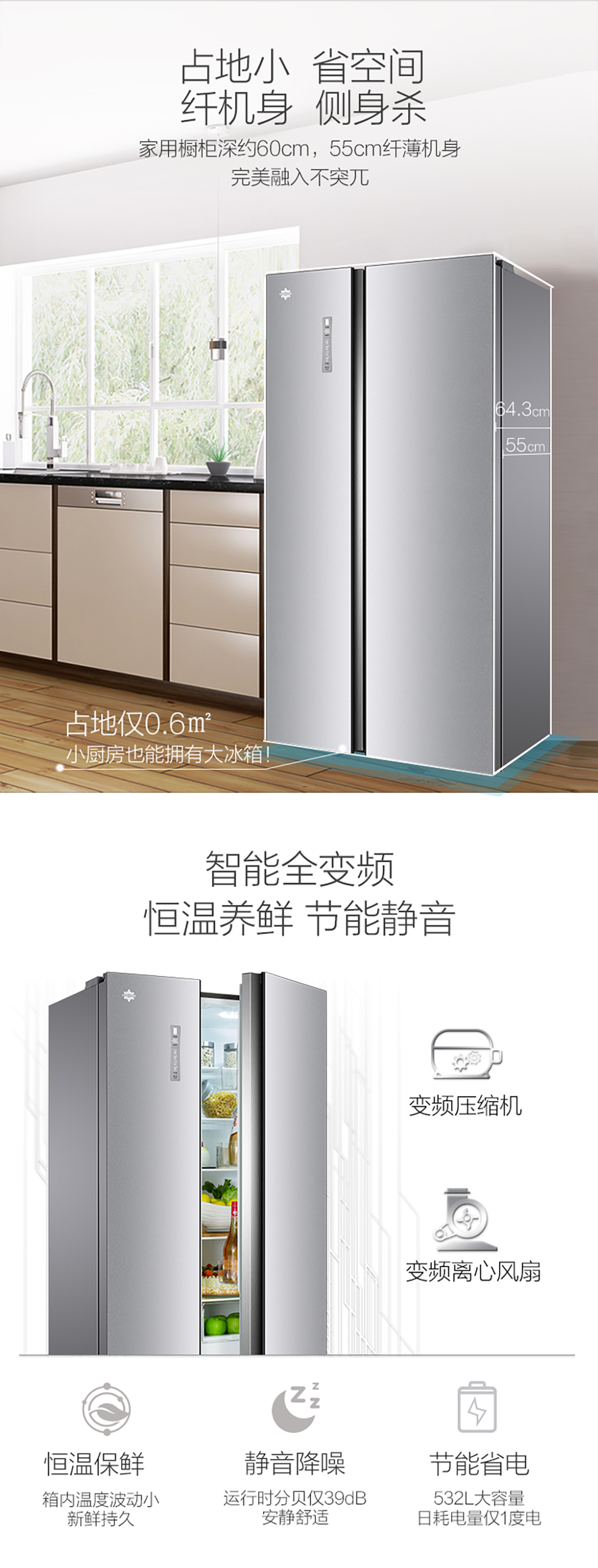 搭载-33℃深冻锁鲜科技,肉汁饱满更长久。采用离子长效抗菌净味,抗菌率高达99.9%。3D沐风,风冷养鲜,无需凿霜。