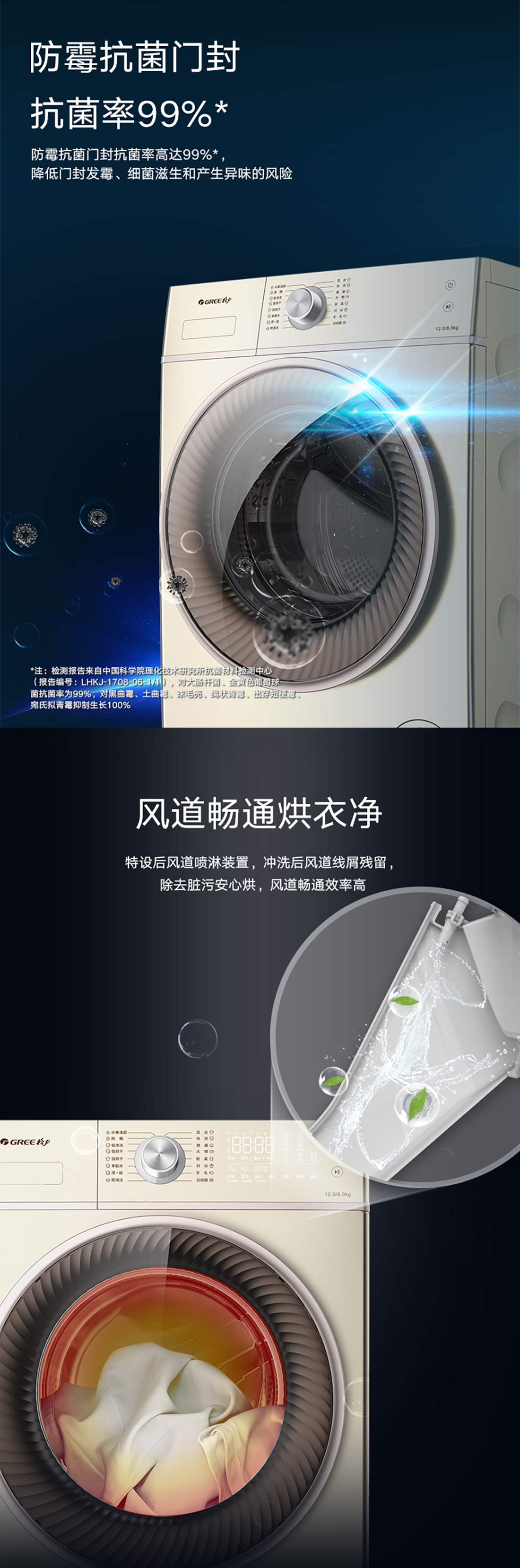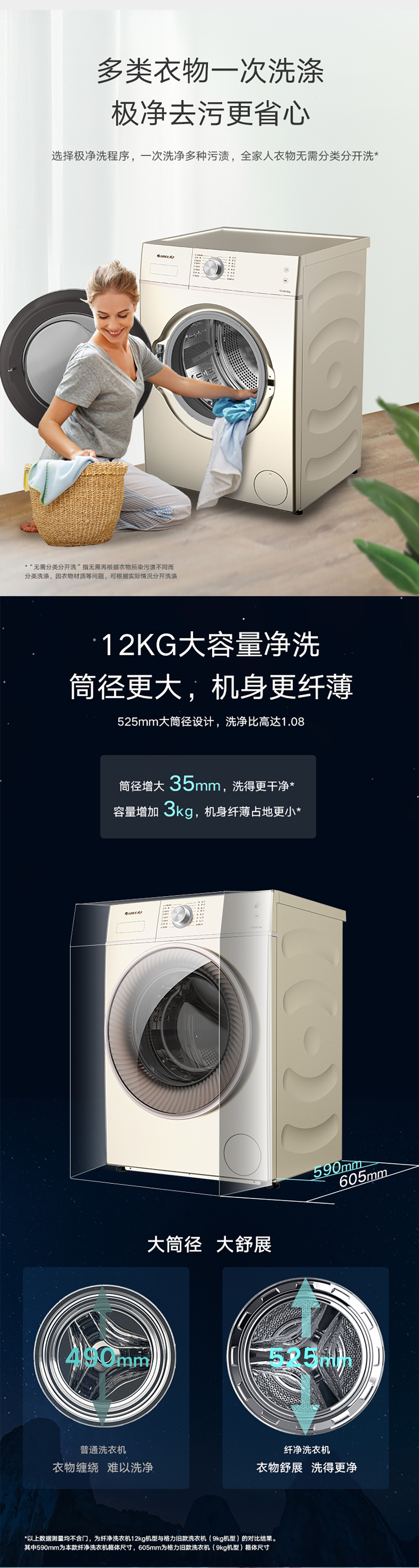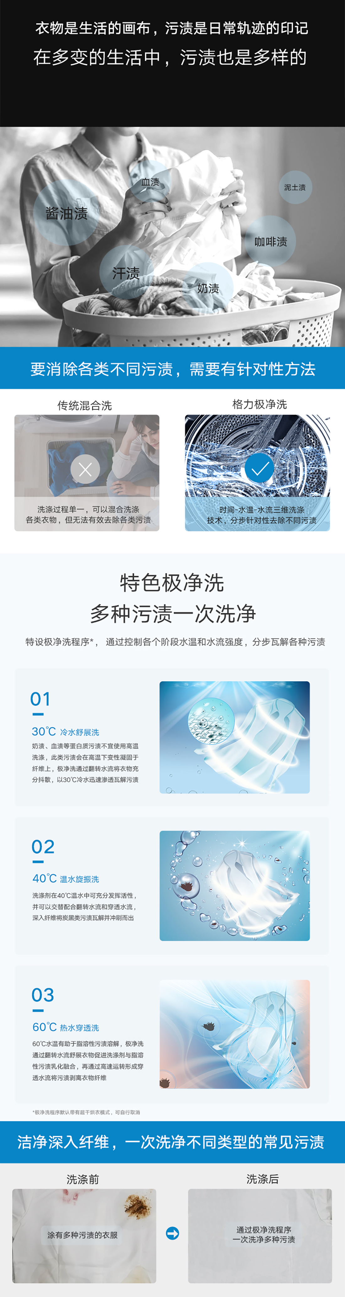 极净去污,一次洗净多类污渍;大容量,全家人衣物无需分类分开洗;洗烘一体,即洗即烘即穿.