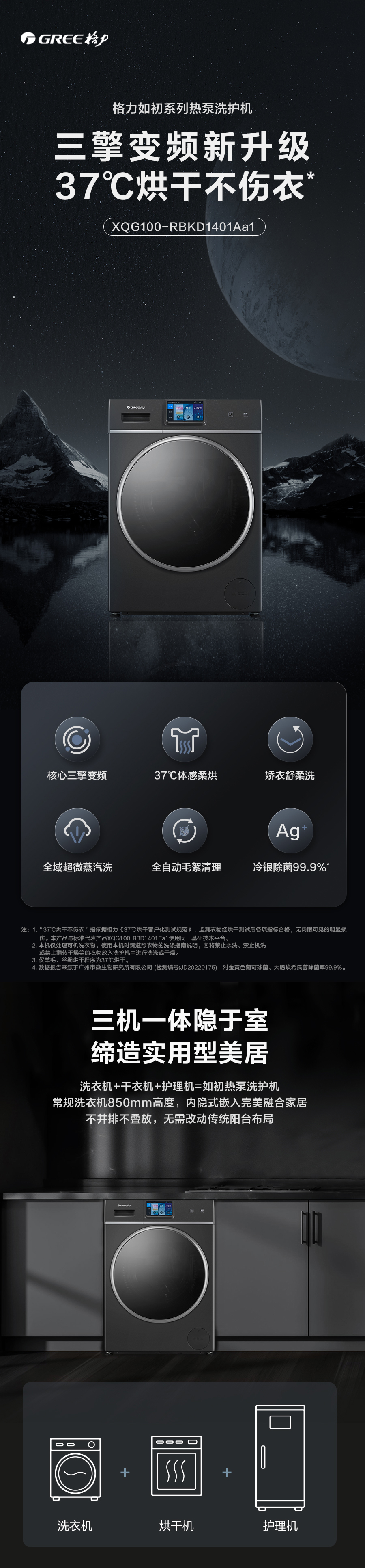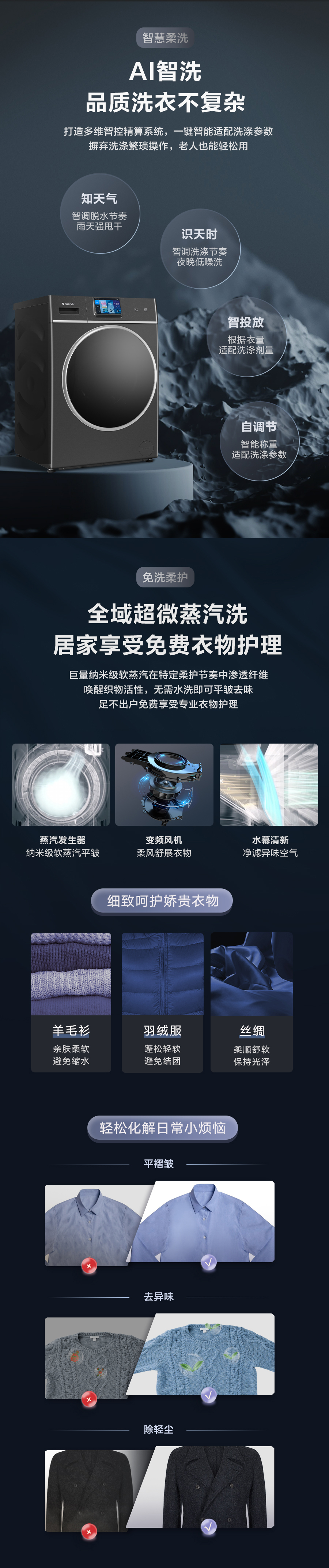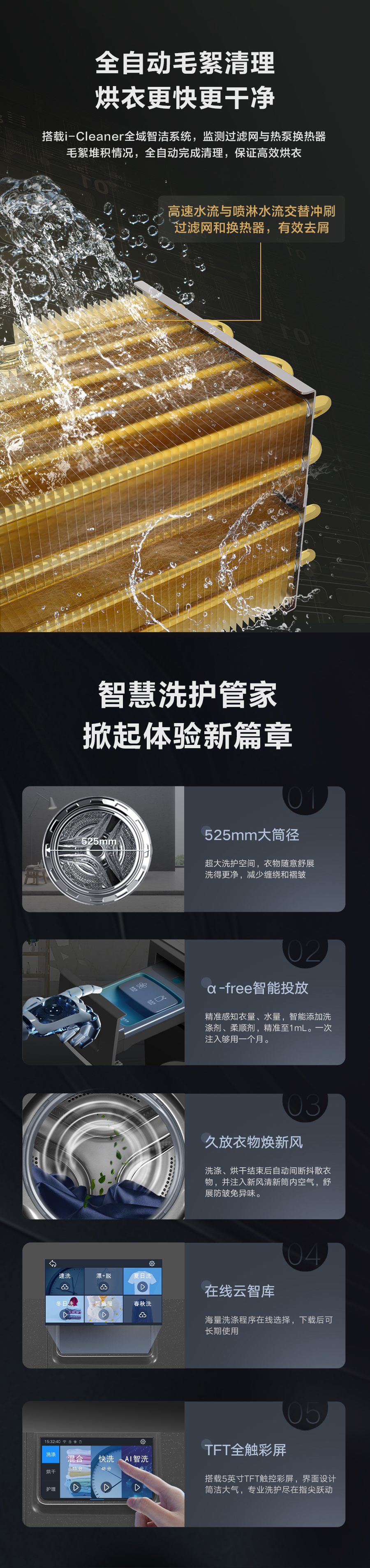 37℃低温柔烘不伤衣;全域超微蒸汽洗;ICleaner全域智清洁